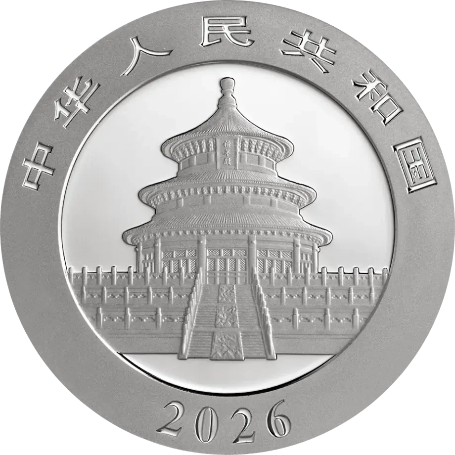 The reverse of the 2026 Silver Panda features two pandas seated close together beside a small pond, one gently leaning its head toward the other in a calm, intimate moment. The background includes bamboo shoots, textured rocks, and a tranquil water surface, adding depth and natural beauty to the composition. Inscriptions read “30 g,” “Ag .999,” and the face value “10 元.” The obverse presents the Hall of Prayer for Good Harvests at the Temple of Heaven in Beijing — one of China’s most iconic cultural landmarks — surrounded by the inscription “People’s Republic of China” in Chinese characters and the year 2026. This obverse motif has appeared on every coin in the series since its inception, serving as a consistent mark of authenticity.